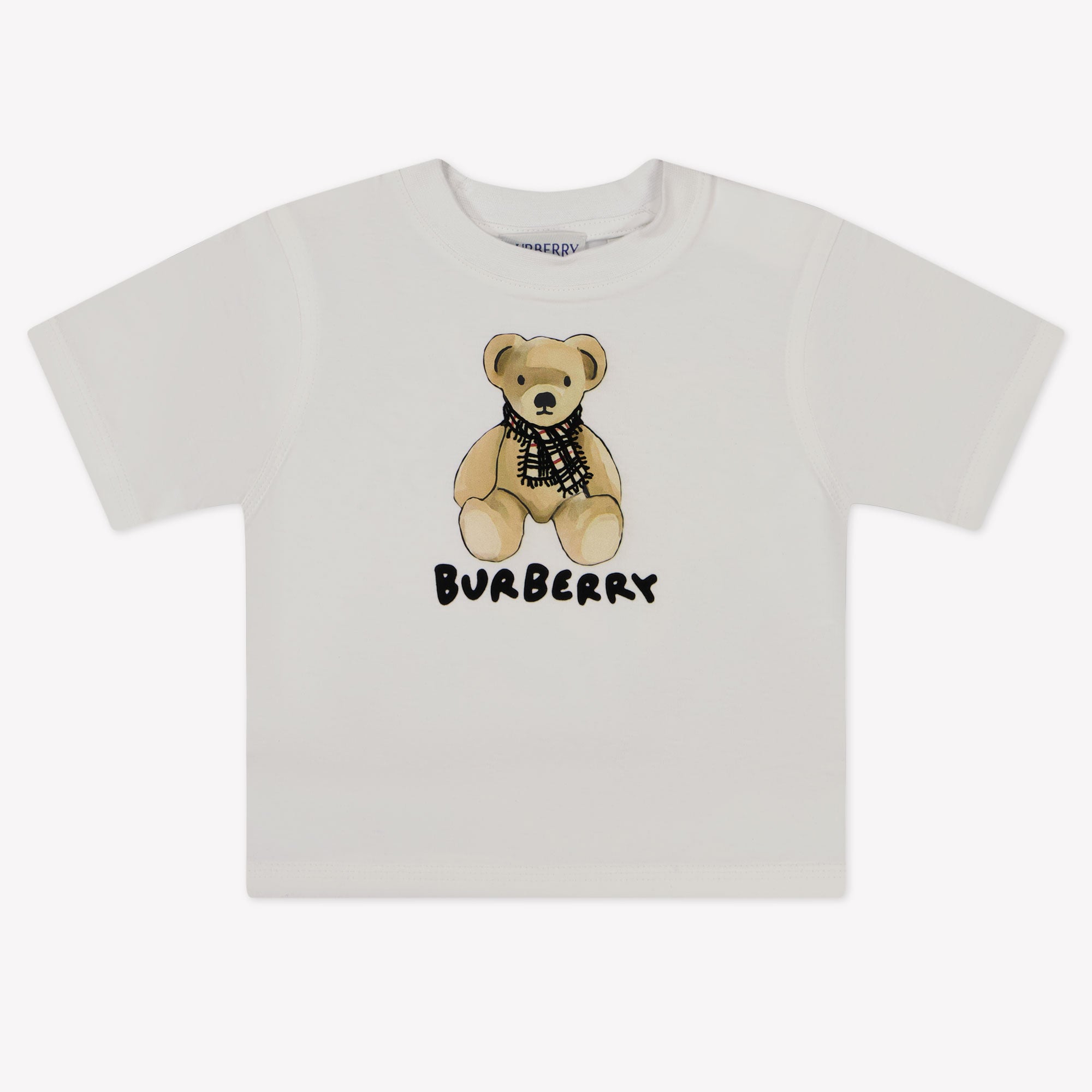 Ontdek het ultieme comfort en verfijning met het Burberry baby t-shirt in zuiver wit. 🌟 Het iconische teddybeerontwerp, subtiel geaccentueerd met Burberry's kenmerkende ruitmotief, voegt een speelse elegantie toe.