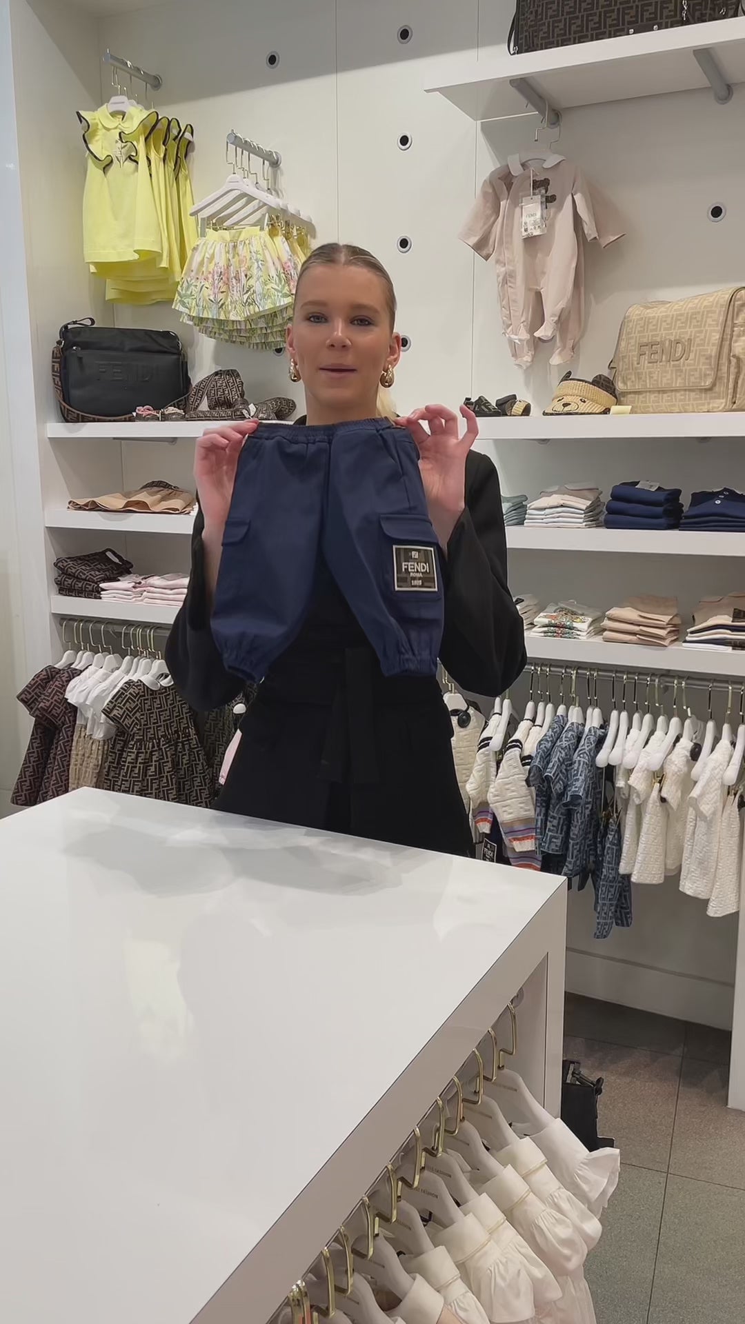 Ontdek de ultieme verfijning voor jouw kleintje met het Fendi babybroekje in diep navy. De luxueuze stof voelt zijdezacht aan, terwijl de perfecte pasvorm zorgt voor comfort en bewegingsvrijheid.