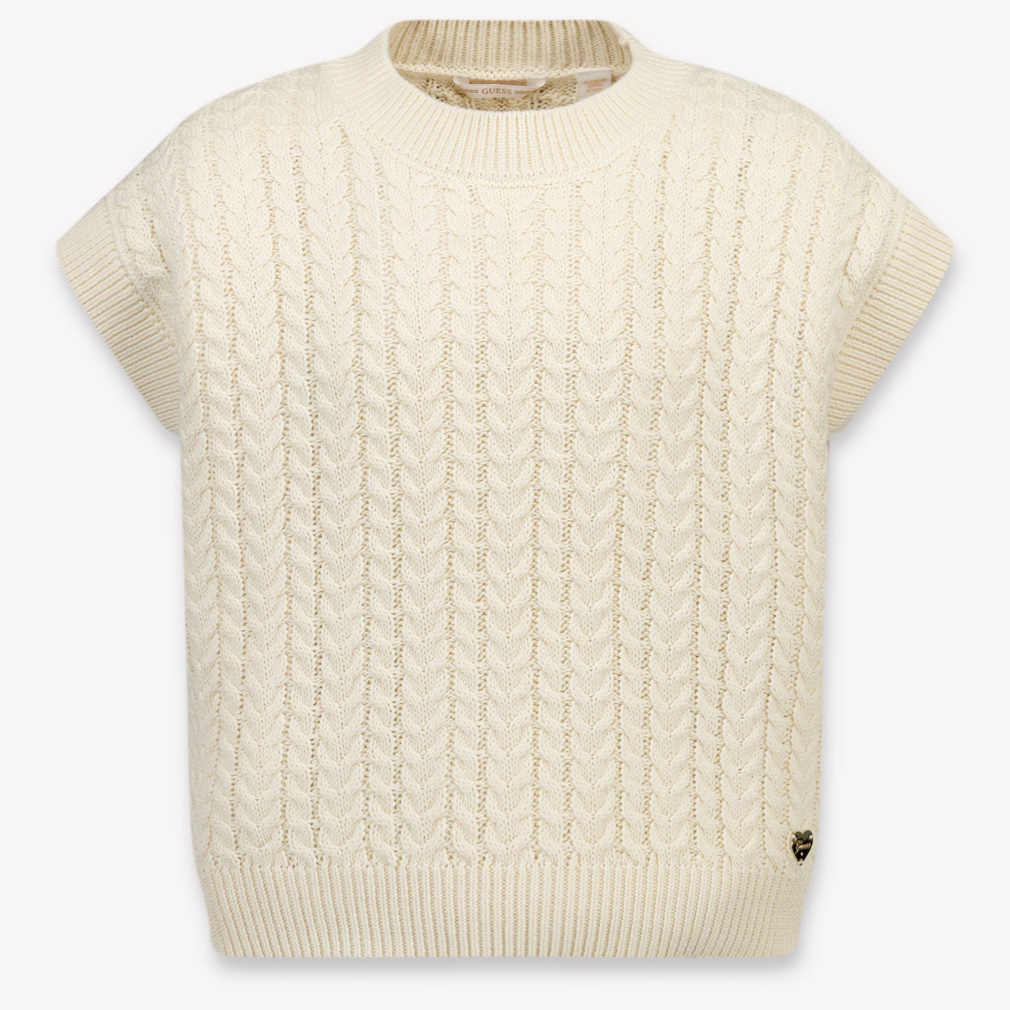 Omarm een tijdloze elegantie met dit prachtige beige T-shirt van Guess voor meisjes. Het verfijnde kabelbreisel, gecombineerd met de zachte, luxe feel van het materiaal, geeft je dochter een stijlvolle uitstraling die zowel klassiek als modern aanvoelt. De subtiele details, zoals het fijne ribboord en het gouden hartlogo, maken dit item tot een echte must-have voor elke garderobe. 🌾✨